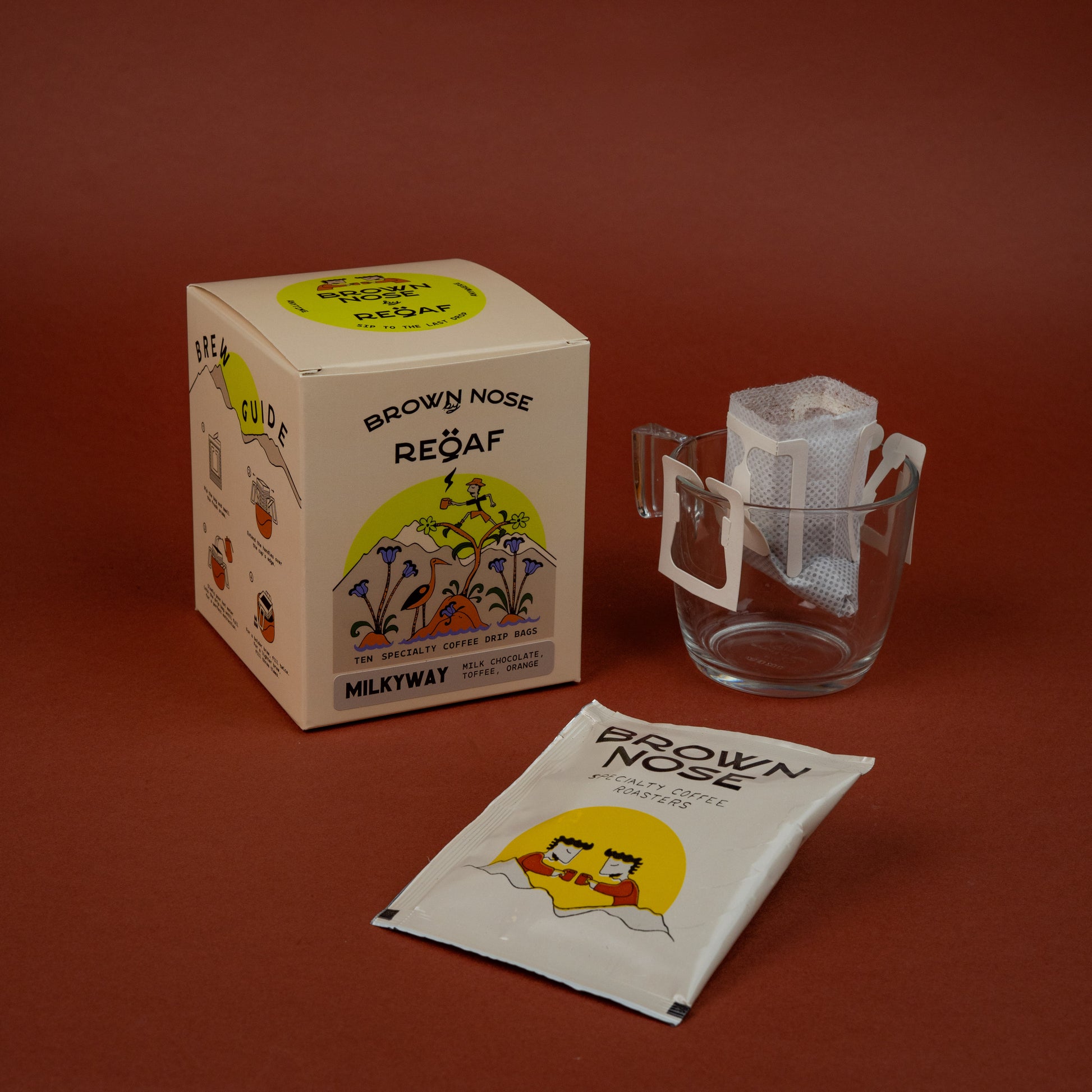 The Brown Nose by ReQaf box features the iconic Milky Way blend — a fan favorite at Brown Nose cafés — now crafted into a drip coffee bag format for the first time. This collaboration brings café-level coffee to your hands with no machines, no barista, and no mess — just pure flavor and simplicity in every cup.